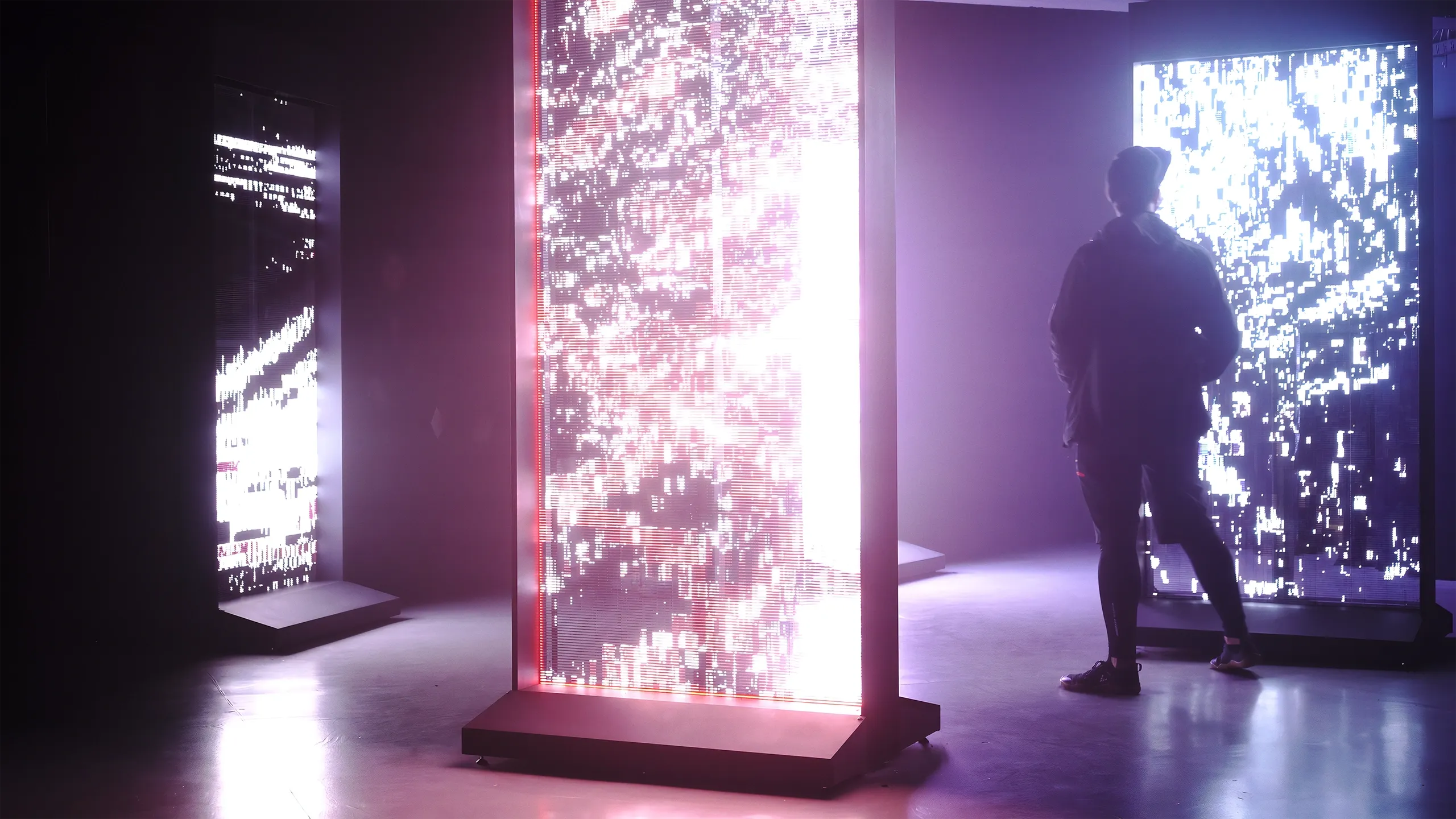 As visitors navigate the exhibit, the interplay between artistic expression and human interaction shapes the display of movement and color. Each portal is connected to the others, possessing spatial awareness, of its relation to other portals, as well as individuals glancing at its entryway. This allows visitors to take a moment, pause, and reflect on their relationship with the forms and activities that collectively shape our digital lives every day.
