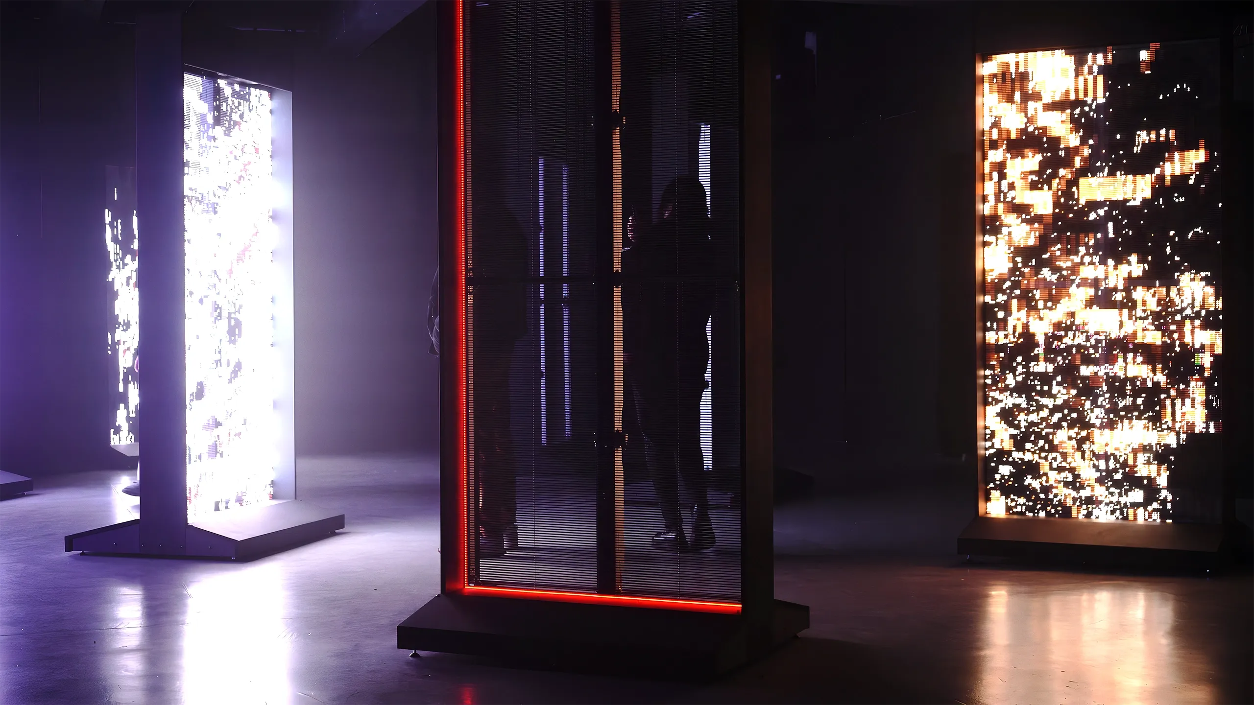 The immersive installation features sixteen transparent portals, each revealing a unique intersection of the virtual domain. Presenting a dual presence — skillfully portraying a simulated complex system and a tangible resemblance of our virtual reality.